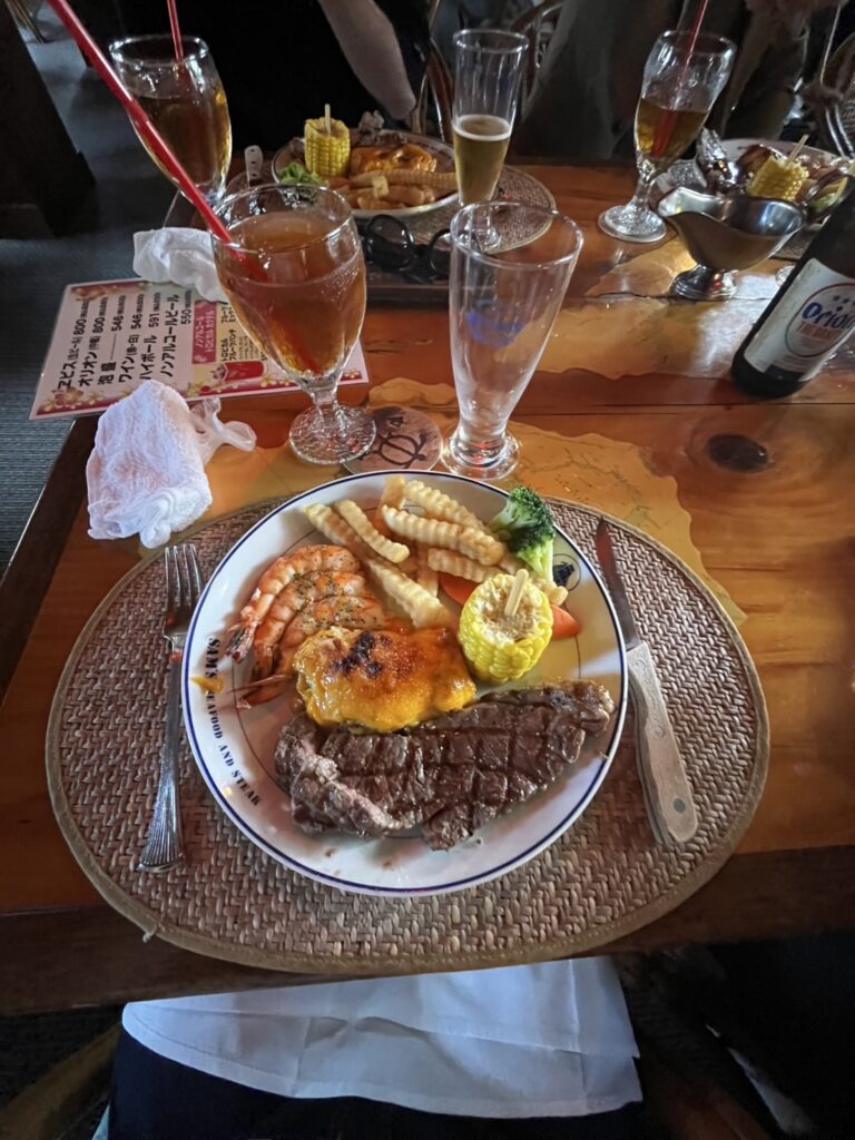ステーキが有名だそうです。オリオンビールもお昼からいただきました!
